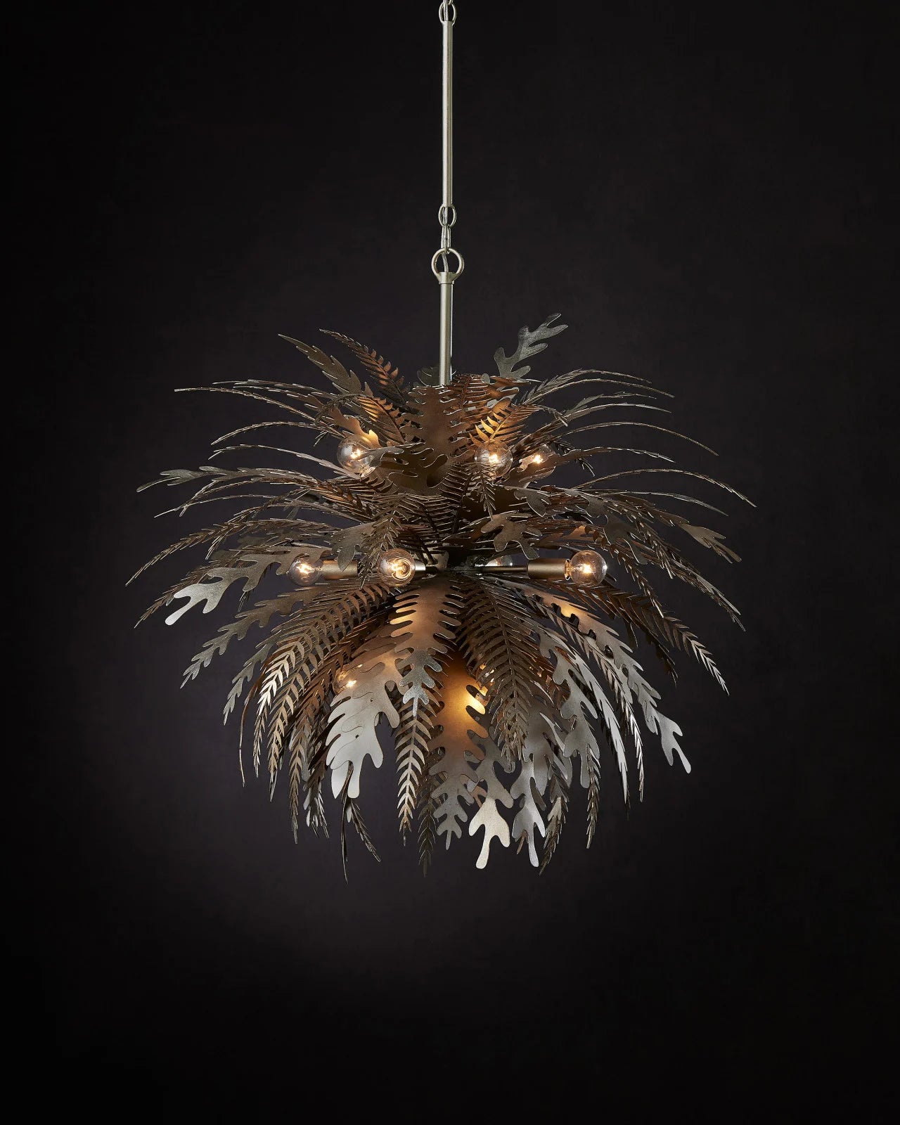 Wildly exuberant in its energy, the Abysill Chandelier is a sensational creation exploding with flora in varying wrought iron shapes. Designed by Ian Thornton, the organic, nature-inspired chandelier was seriously labor-intensive to create, as each of the leaves is individually laser cut and bent, then welded to a center core to mimic how a plant would grow from a planter. The intermingling of contemporary silver leaf and dark silver leaf finishes creates an even more intense sense of texture. The hanging rods are adjustable.