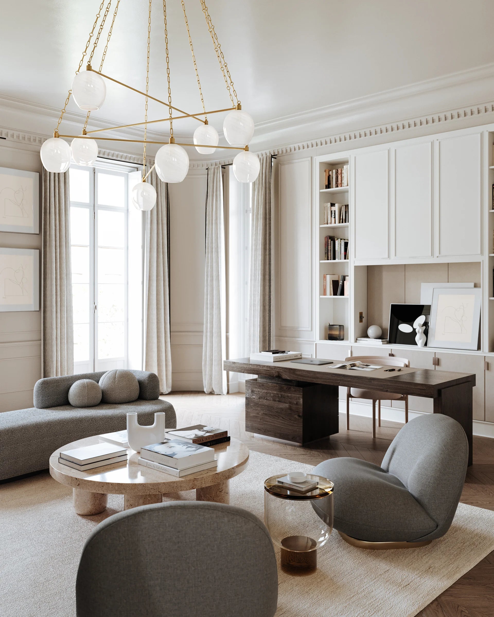 Abstract and airy, Bryley plays with balance and symmetry. Pairs of cloud etched glass shades connected by a single metal rod are suspended from a delicate jewelry-like chain in a layered pattern that creates movement and interest.