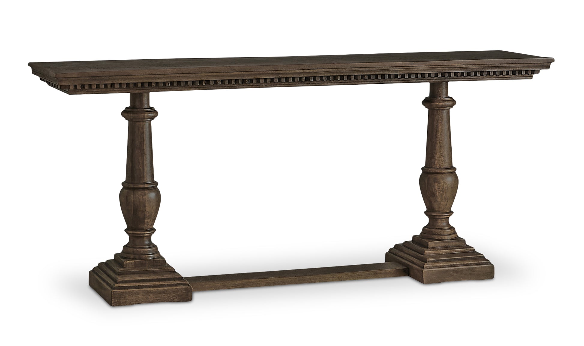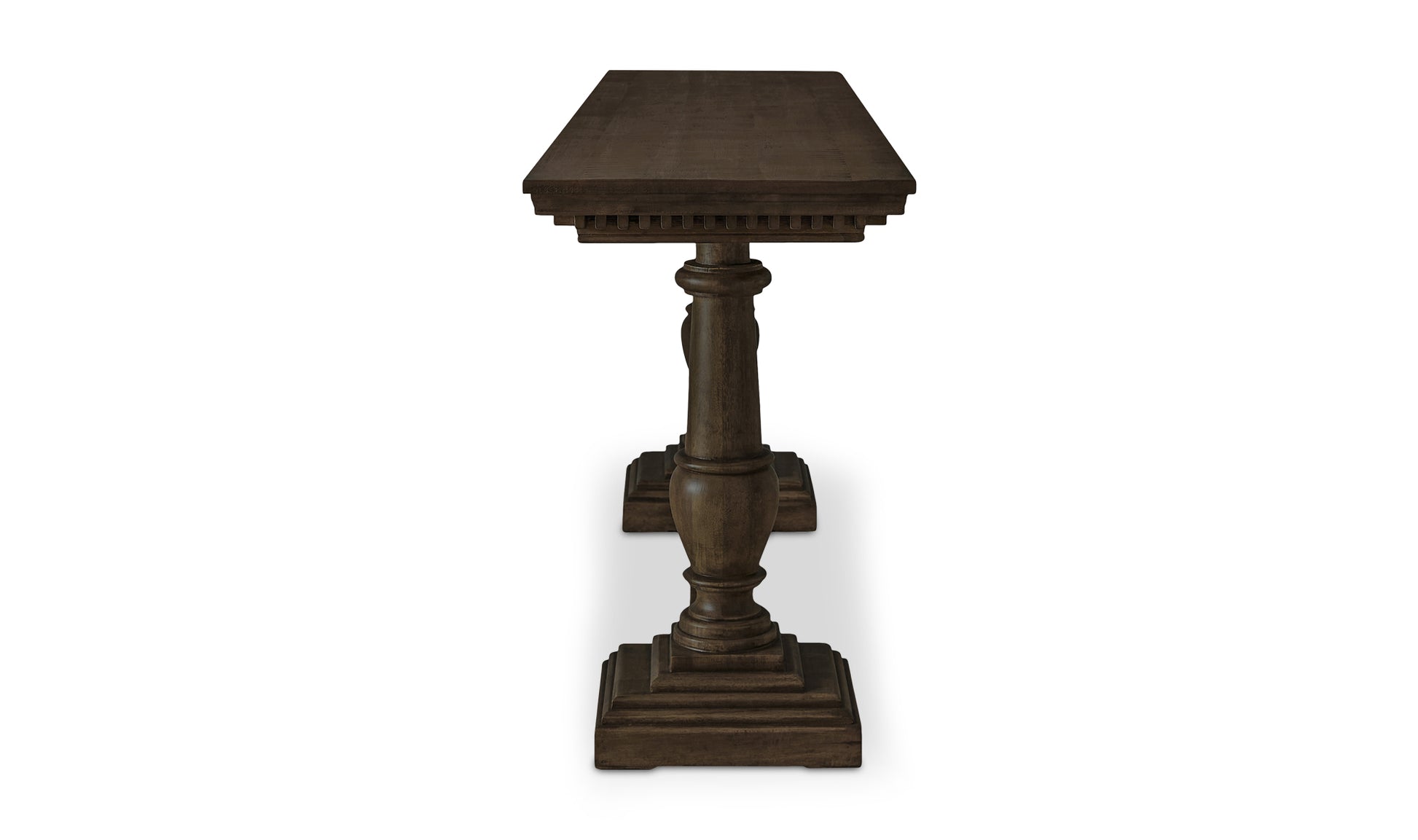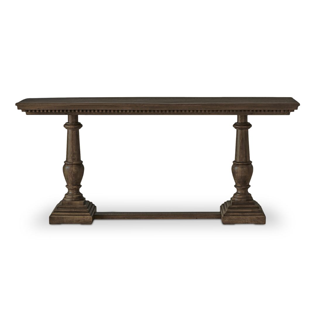 The Beatrice console table blends traditional elements with modern craftsmanship. Meticulously molded detailing and graceful leg profiles with a stretcher in between showcase its sophisticated design. Crafted from sustainable mango wood, the rich brown finish enhances the natural grain.