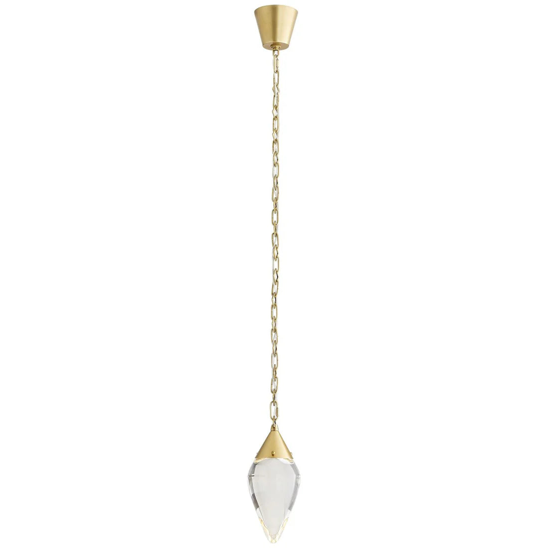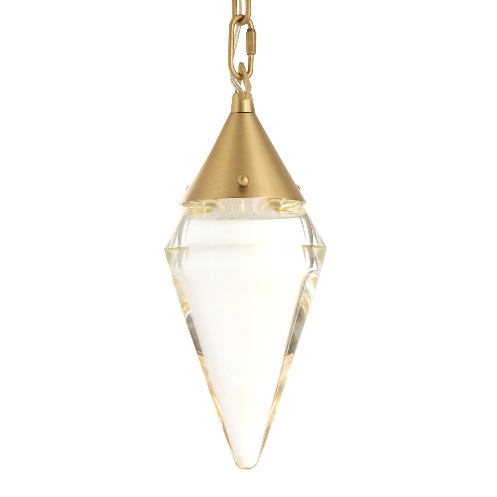 The foundation of this piece is composed of a solid clear crystal diffuser that is stylishly suspended by an antique brass steel chain. The chain features an alternating diamond to oval pattern delivering a geometric dynamic that complements its sleek appeal. A neatly concealed LED light imparts an ultra-modern element on this piece while providing a soft illuminating glow to its surroundings.