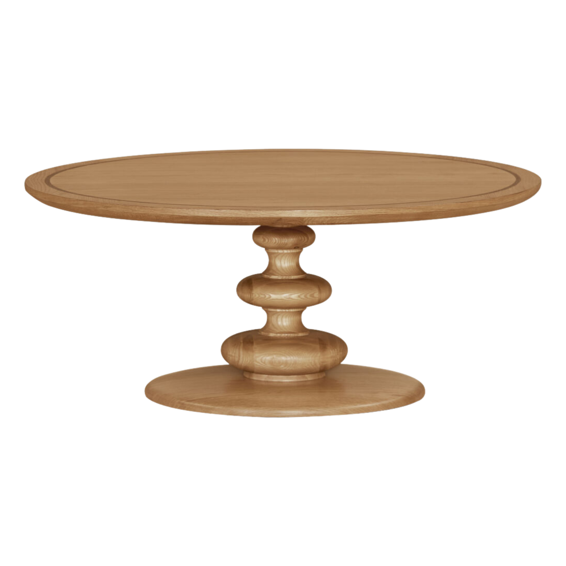 The Eleanor coffee table offers a perfect blend of classic charm and modern sophistication. It features a stunning top crafted from white oak veneer, walnut veneer, and manufactured wood for a refined look. The details of the sturdy turned oak wood base has a timeless appeal.