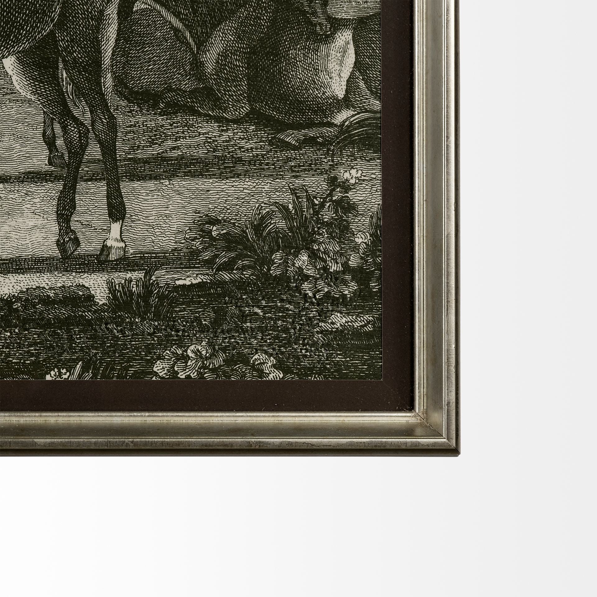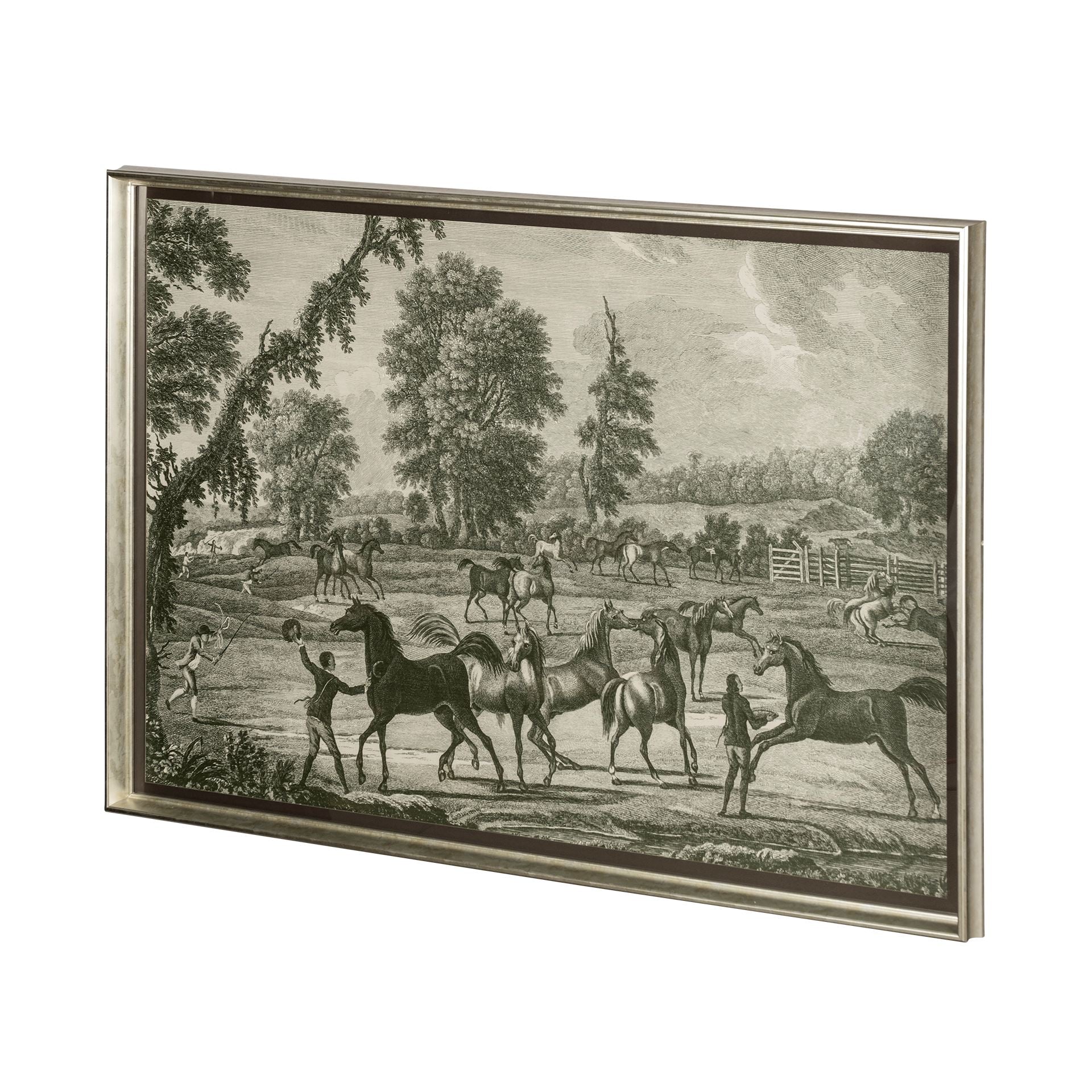 The elegant, framed print depicts majestic, sport horses being prepped for an event by their masters in a mellow, greyscale tone. Enclosed within a rustic frame, this amazing over-sized framed print is sure to liven up any space.