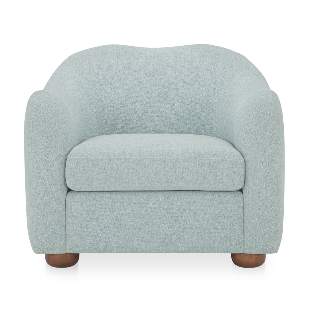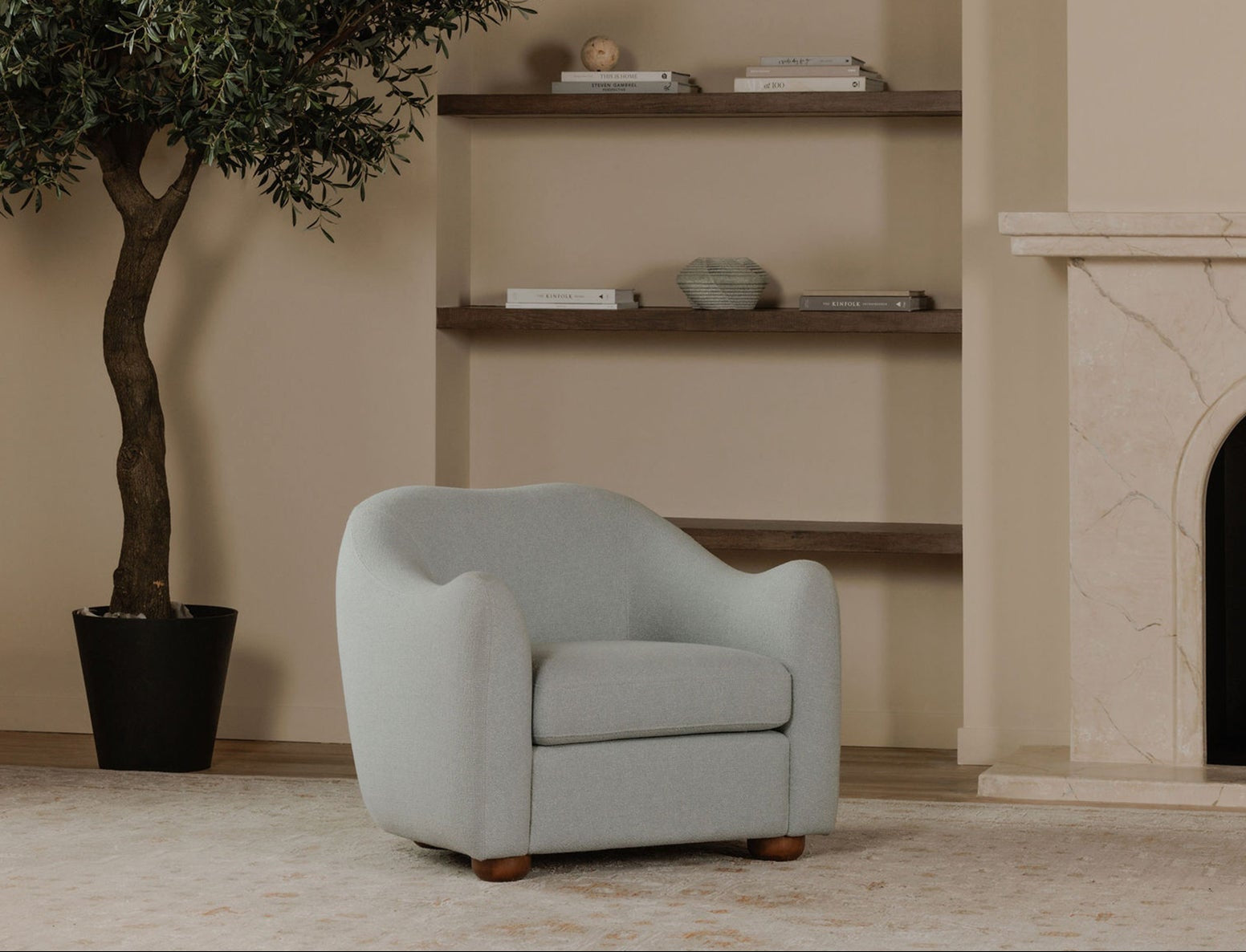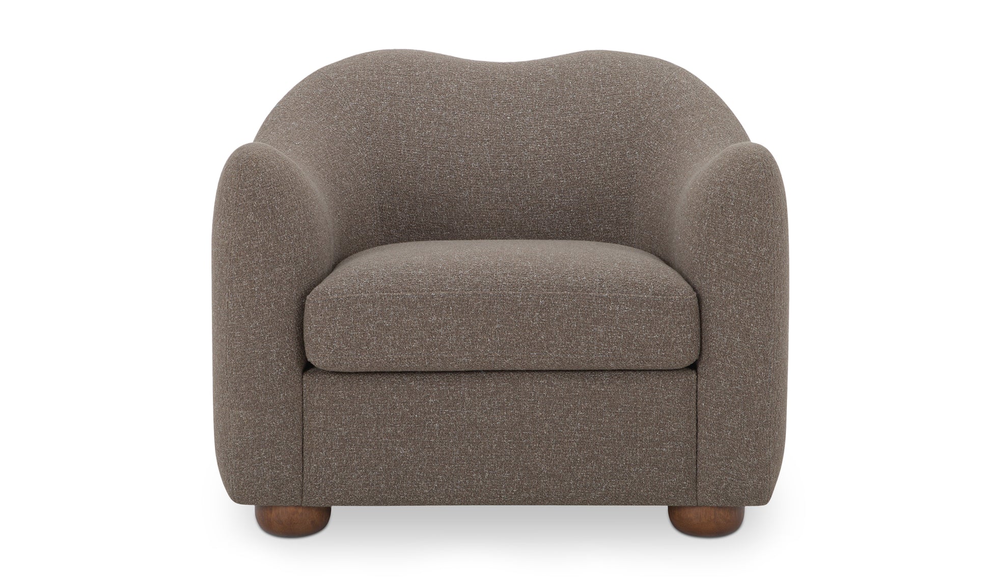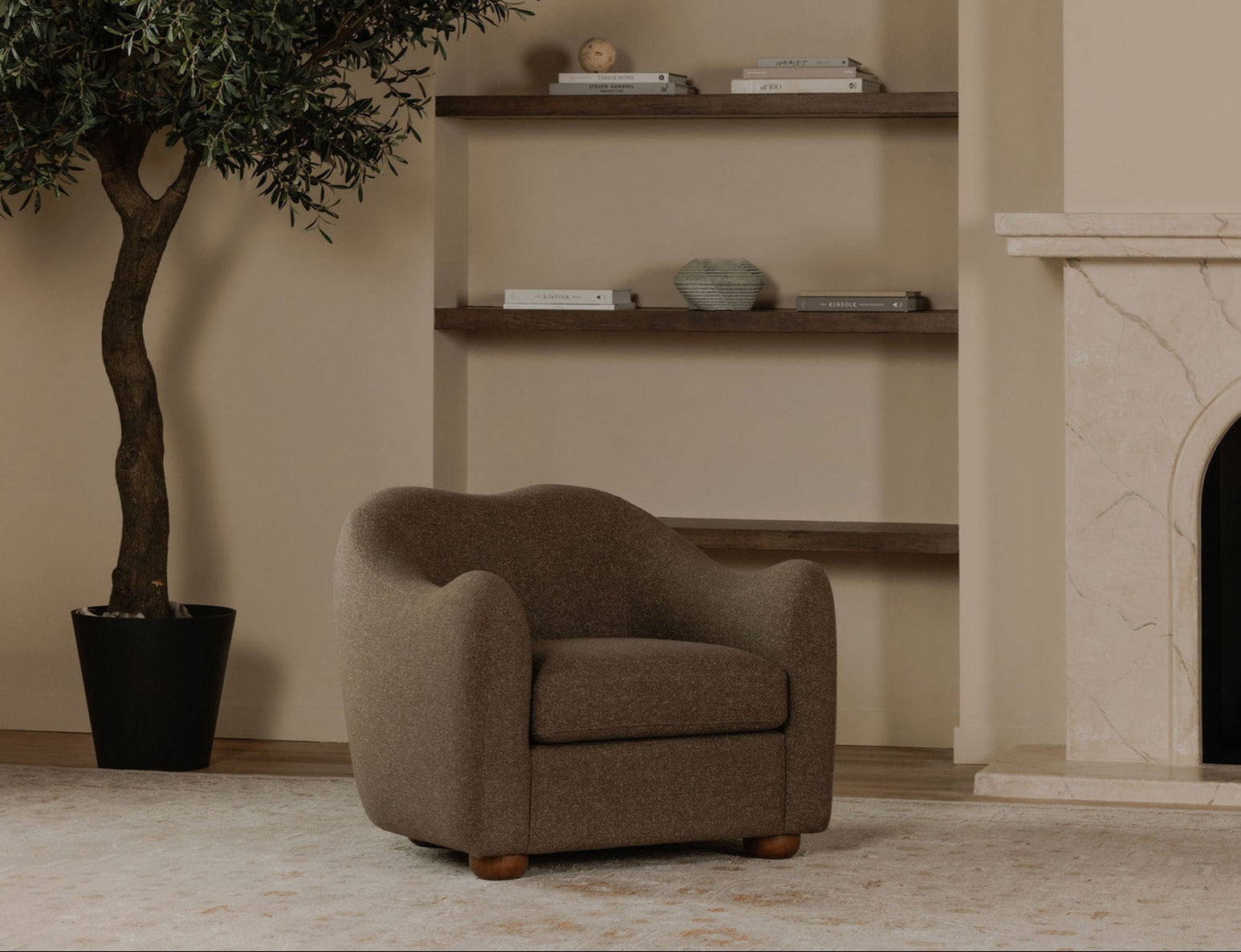 The Iris accent chair's gently sloping arms and rubberwood feet, finished in rich, warm brown inspire a vintage charm, reimagined for contemporary living. Crafted with a removable high-density foam seat cushion and upholstered textured, flecked fabric, it offers supreme comfort. Ideal as a singular focal point or pair, it offers timeless grace and understated sophistication.