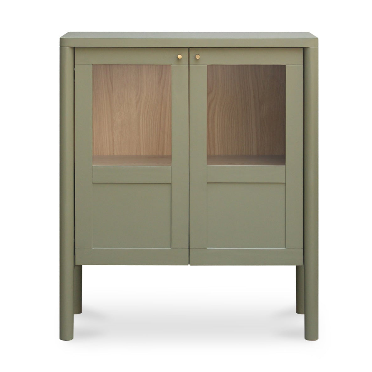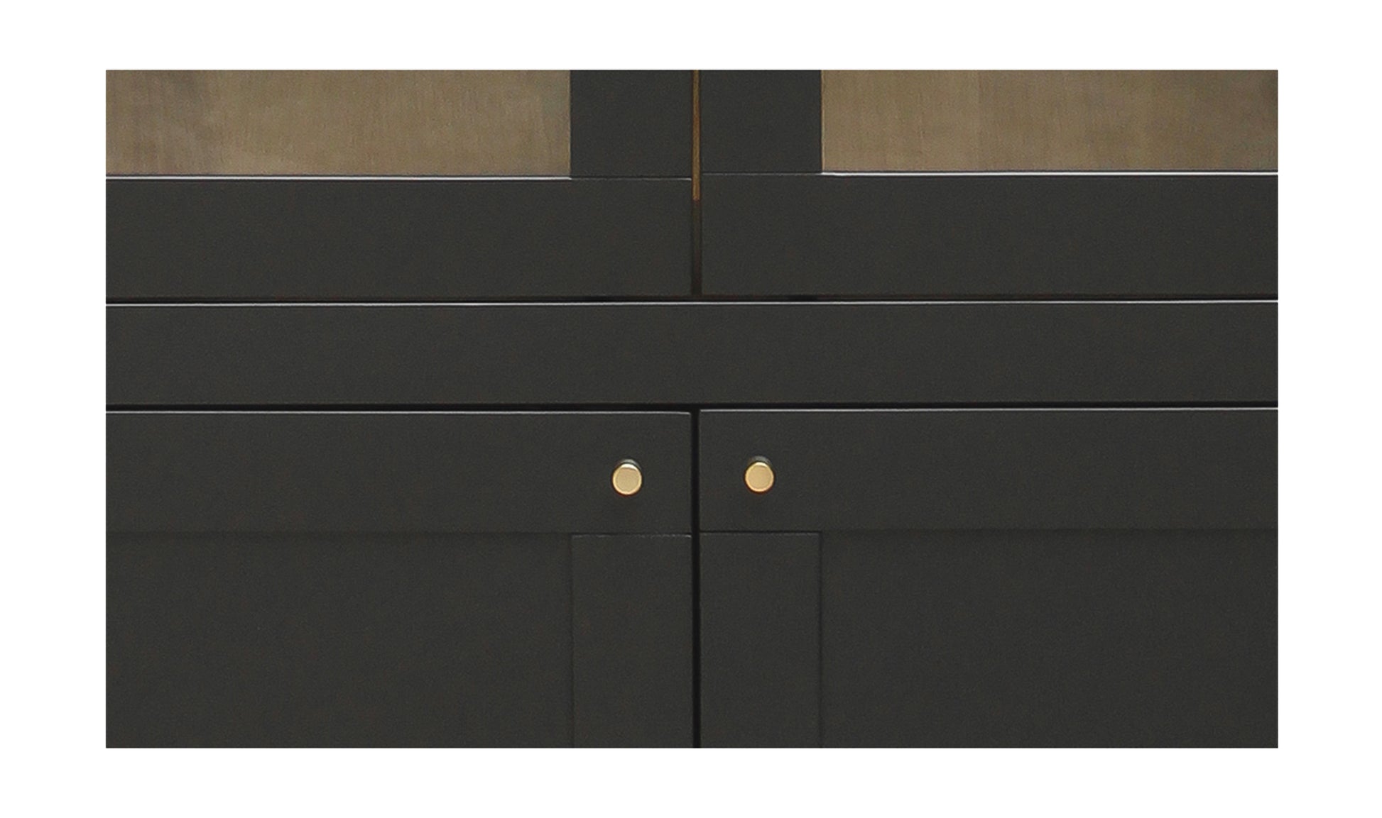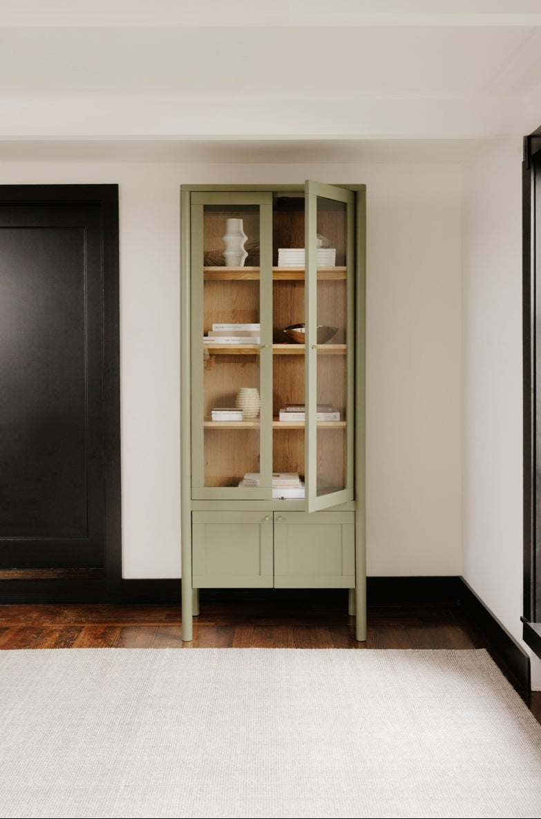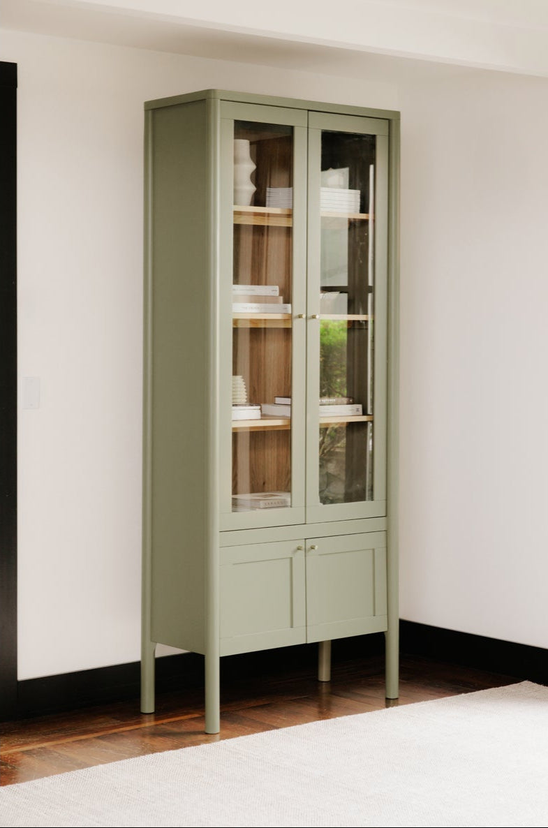 Inspired by classic millwork, the Ivy cabinet's timeless proportions with tempered glass inserts offer a glimpse of treasured items, while a solid pine frame ensures enduring appeal as dowel legs and bronze hardware infuse subtle softness.