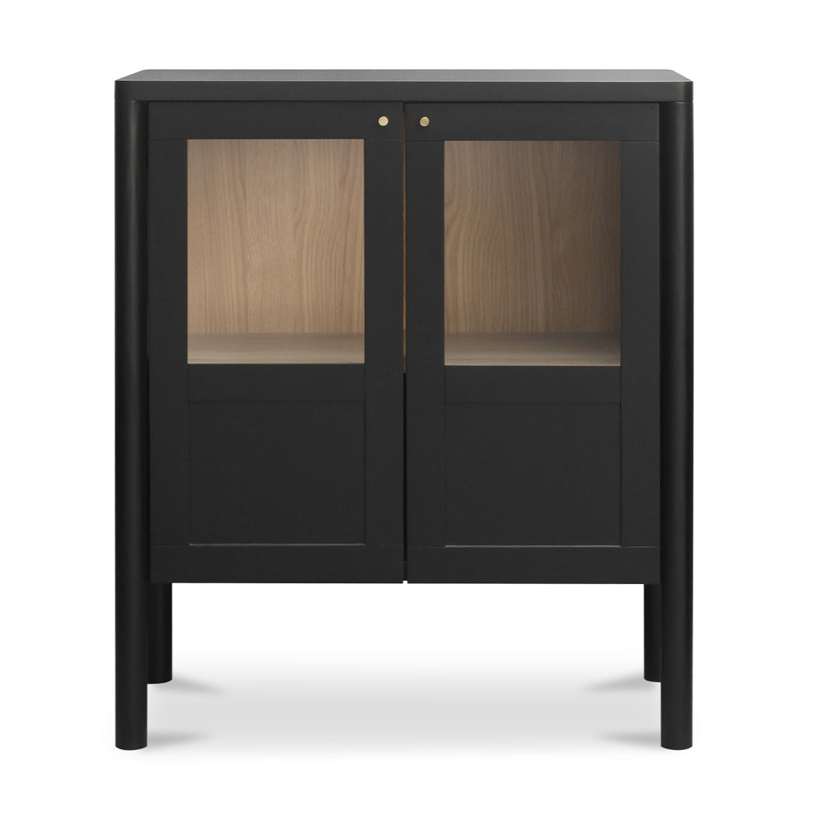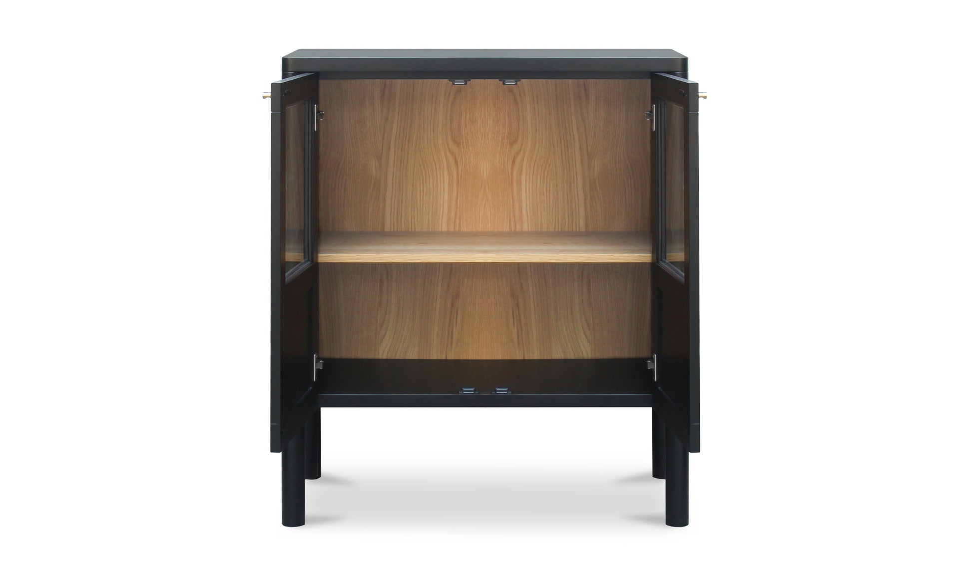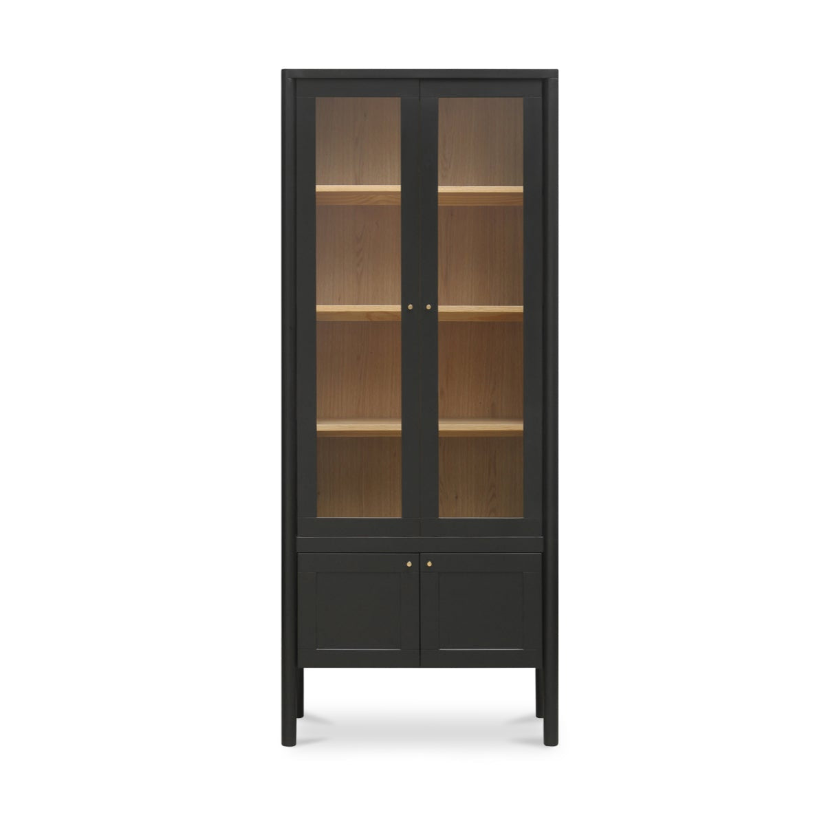 Inspired by classic millwork, the Ivy cabinet's timeless proportions with tempered glass inserts offer a glimpse of treasured items, while a solid pine frame ensures enduring appeal as dowel legs and bronze hardware infuse subtle softness.
