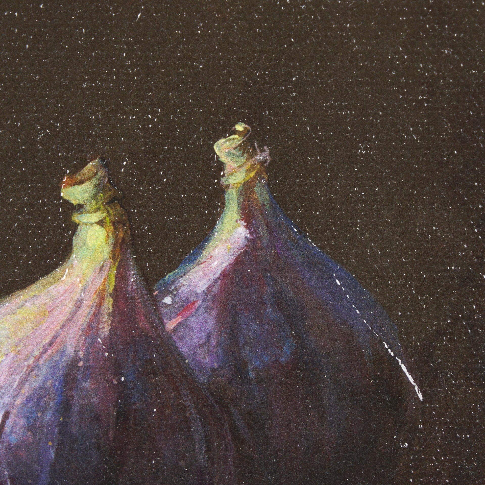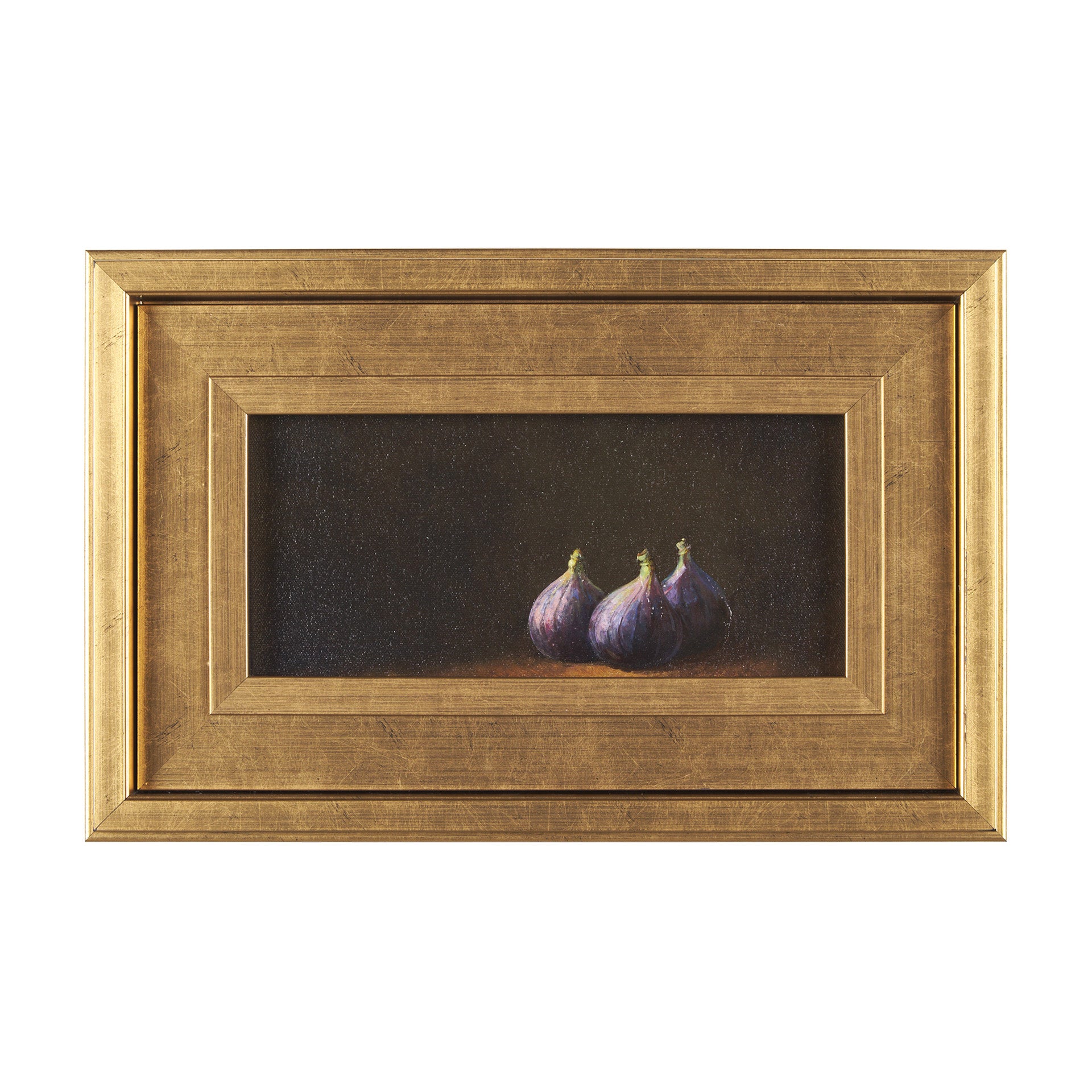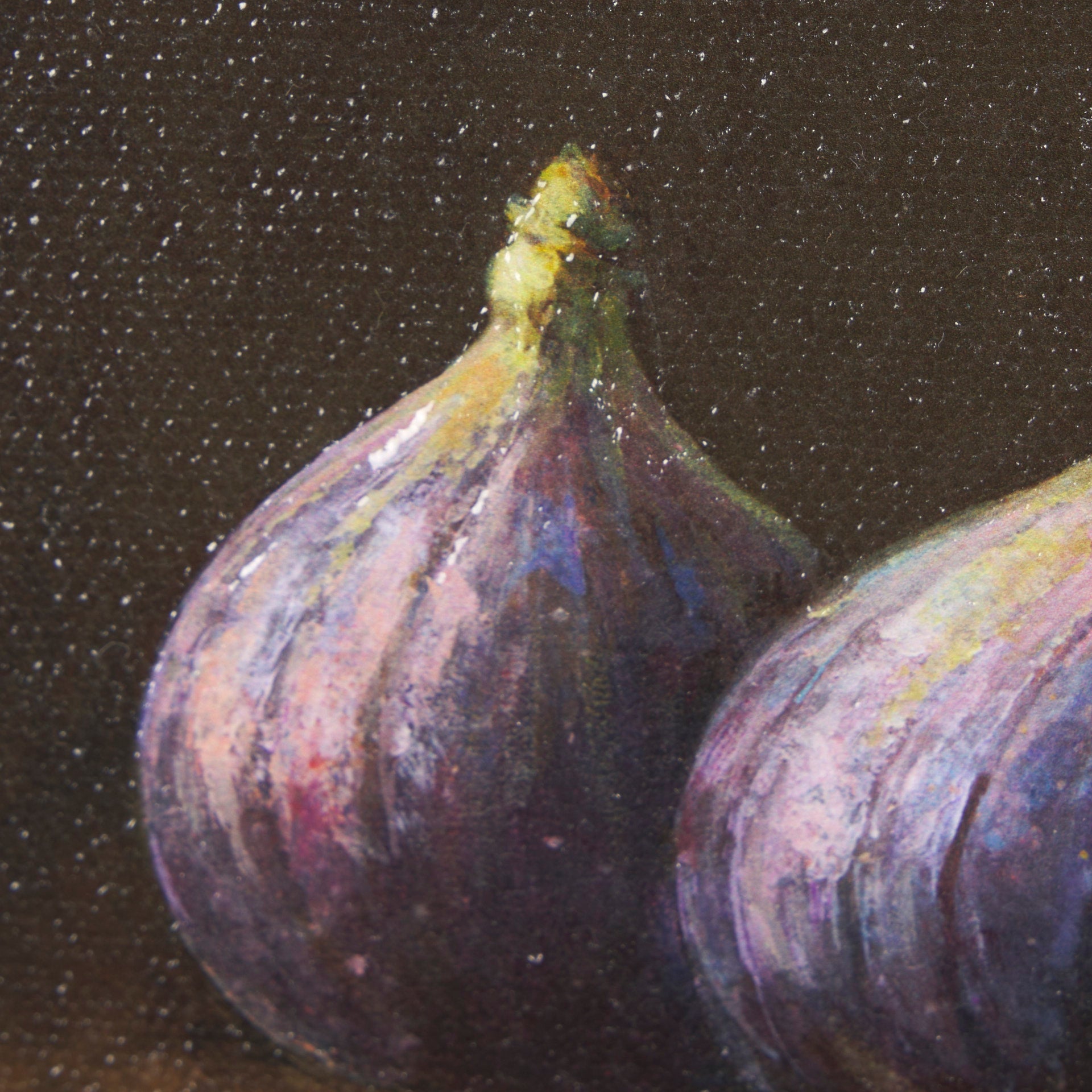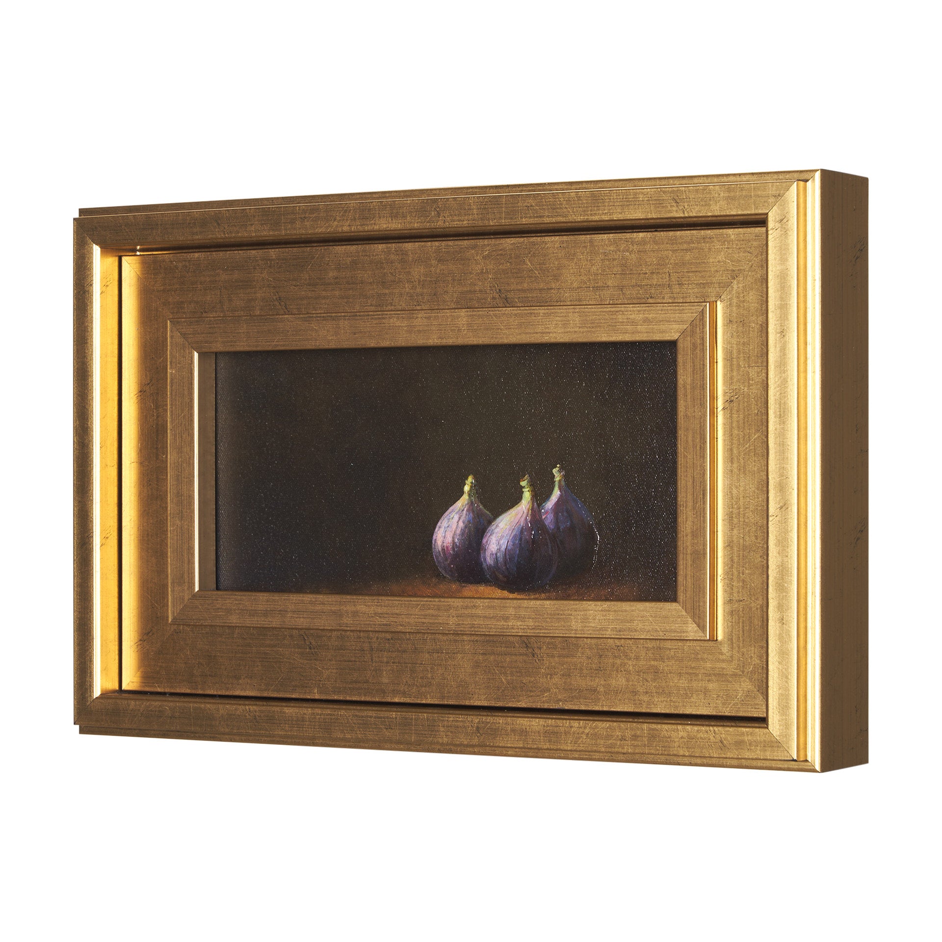 Lone Figs is a hand-embellished acrylic art print on canvas that captures the quiet elegance of three figs against a rich, shadowed backdrop. Golden highlights enhance the deep plum tones, while textured details add depth and dimension. Mounted with backing and set in an expansive gold-look frame, this piece radiates timeless charm—ideal for bringing warmth and old-world sophistication to kitchens, dining areas, or curated gallery walls.