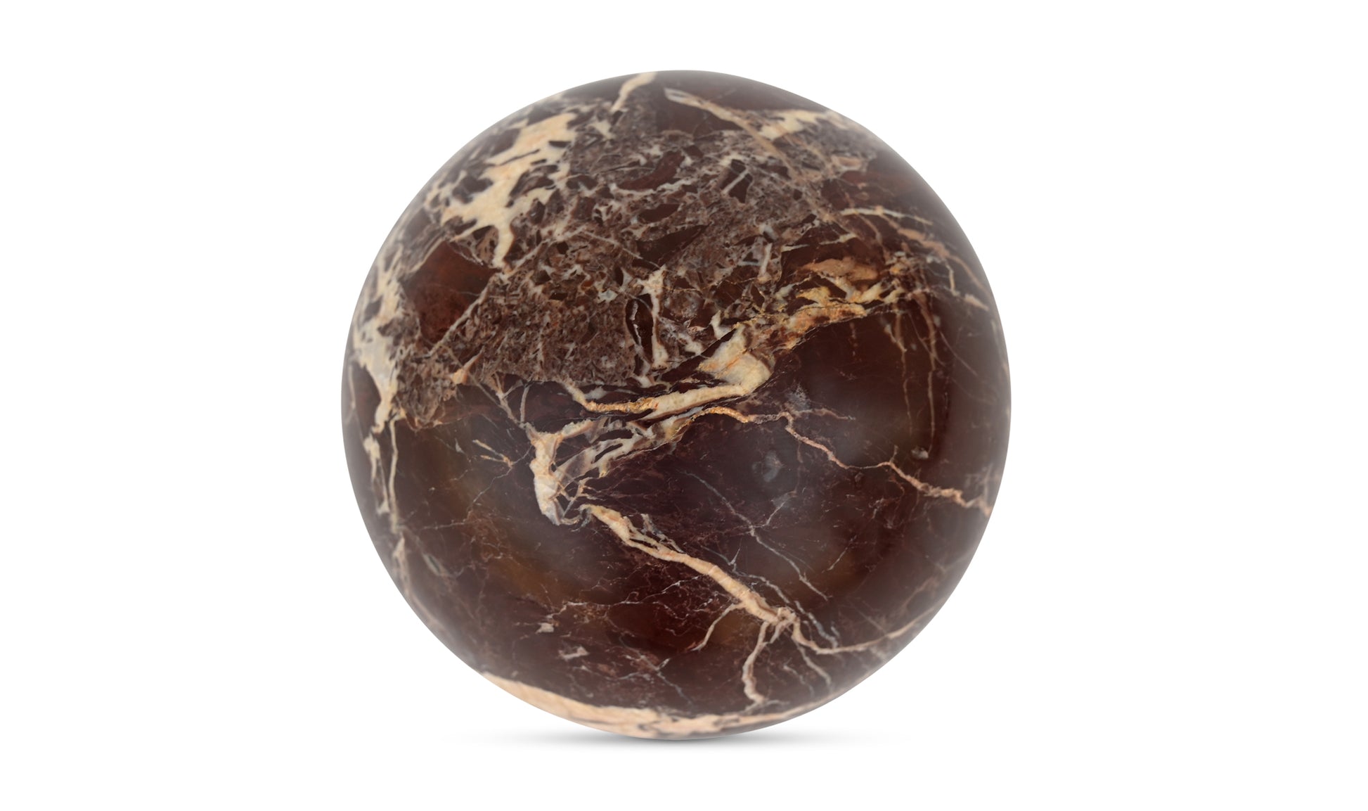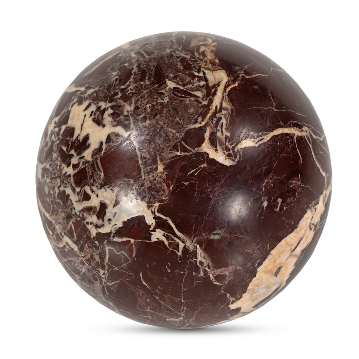 Constructed from solid red levanto marble, this sphere tabletop accent showcases a mesmerizing interplay of expressive gold tones and intricate veining. Versatile and poised, this commanding sphere can prominently display itself thanks to a thoughtfully designed flat surface on the bottom. Black felt is delicately attached to the bottom of the sphere, offering protection against unsightly scratches.