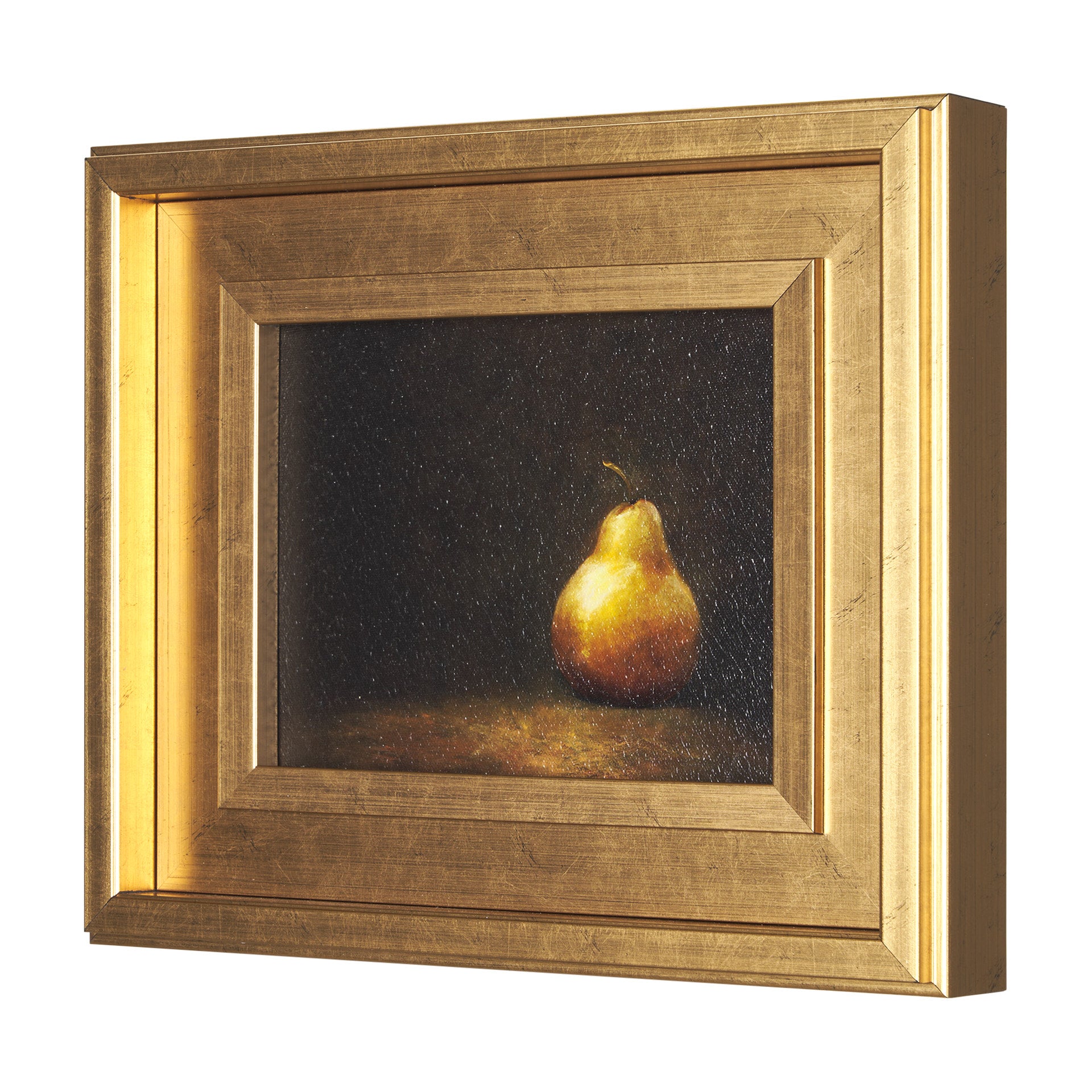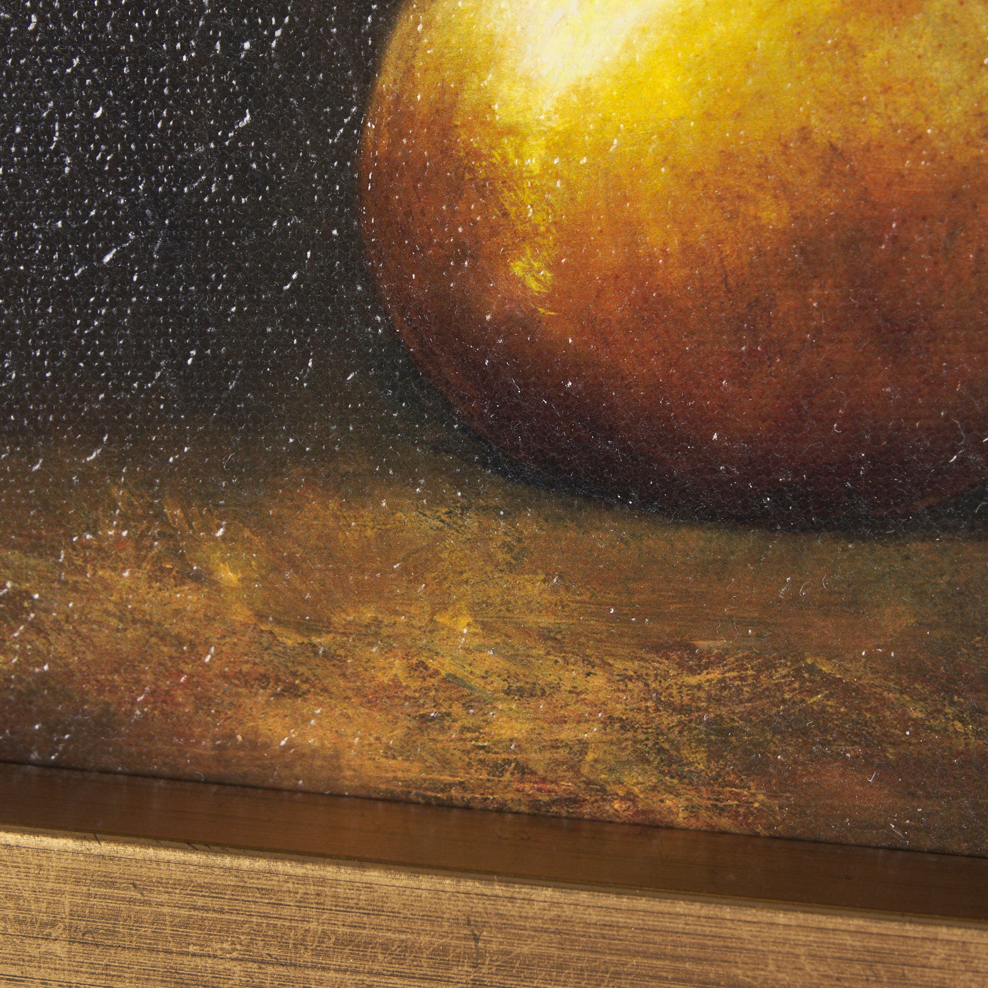 Lone Pear is a hand-embellished acrylic art print on canvas that highlights the quiet beauty of a single golden pear illuminated against a deep, shadowy backdrop. Rich hand-applied textures and gentle highlights bring out the fruit's soft curves and warm tones, adding depth and visual intrigue. Mounted with a backing and framed in an elegant gold-look frame, this piece radiates classic charm — ideal for adding warmth and refined still-life appeal to kitchens, dining spaces, or traditionally inspired interiors.