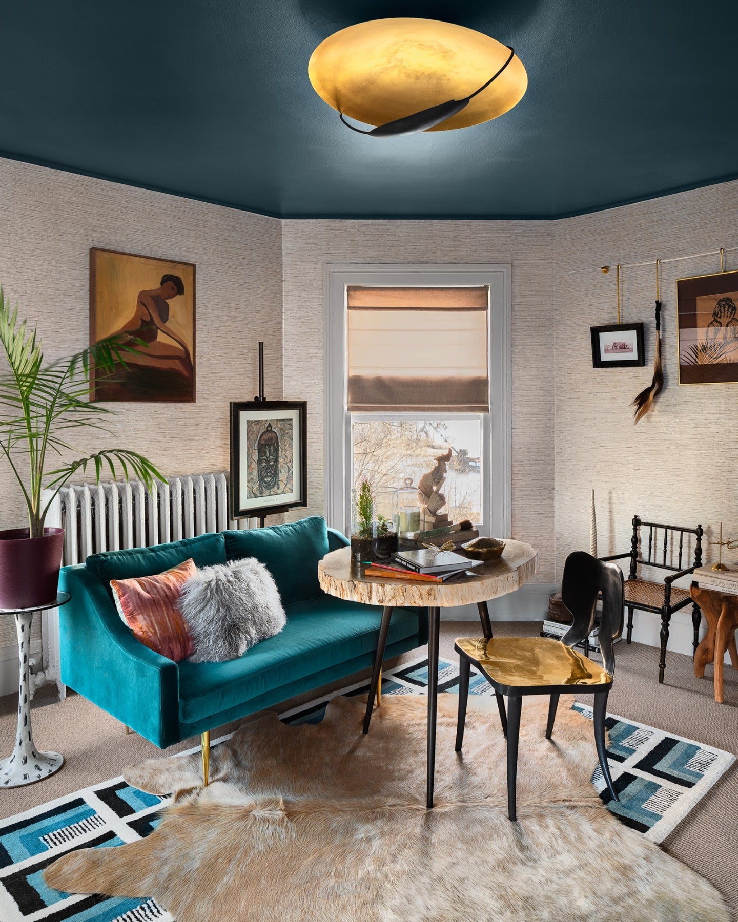 The Pinda flush mount is made of wrought iron in a contemporary gold finish. A design note of merit is how the bulb is set within a cup-like extension that is affixed to the thin, curved arm in a French black finish. When the light reflects off the gold interior, it intensifies the warmth of the illumination.