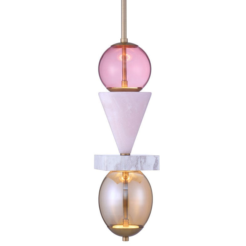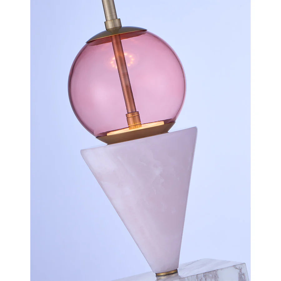 Featuring a stacked geometric silhouette, bold color stories achieved through colored glass, and natural stone completed with sculptural elements to create a delicate balance. The natural white marble and pink jade pieces are cut individually showcasing their unique characteristics paired with a simple winter brass finish.