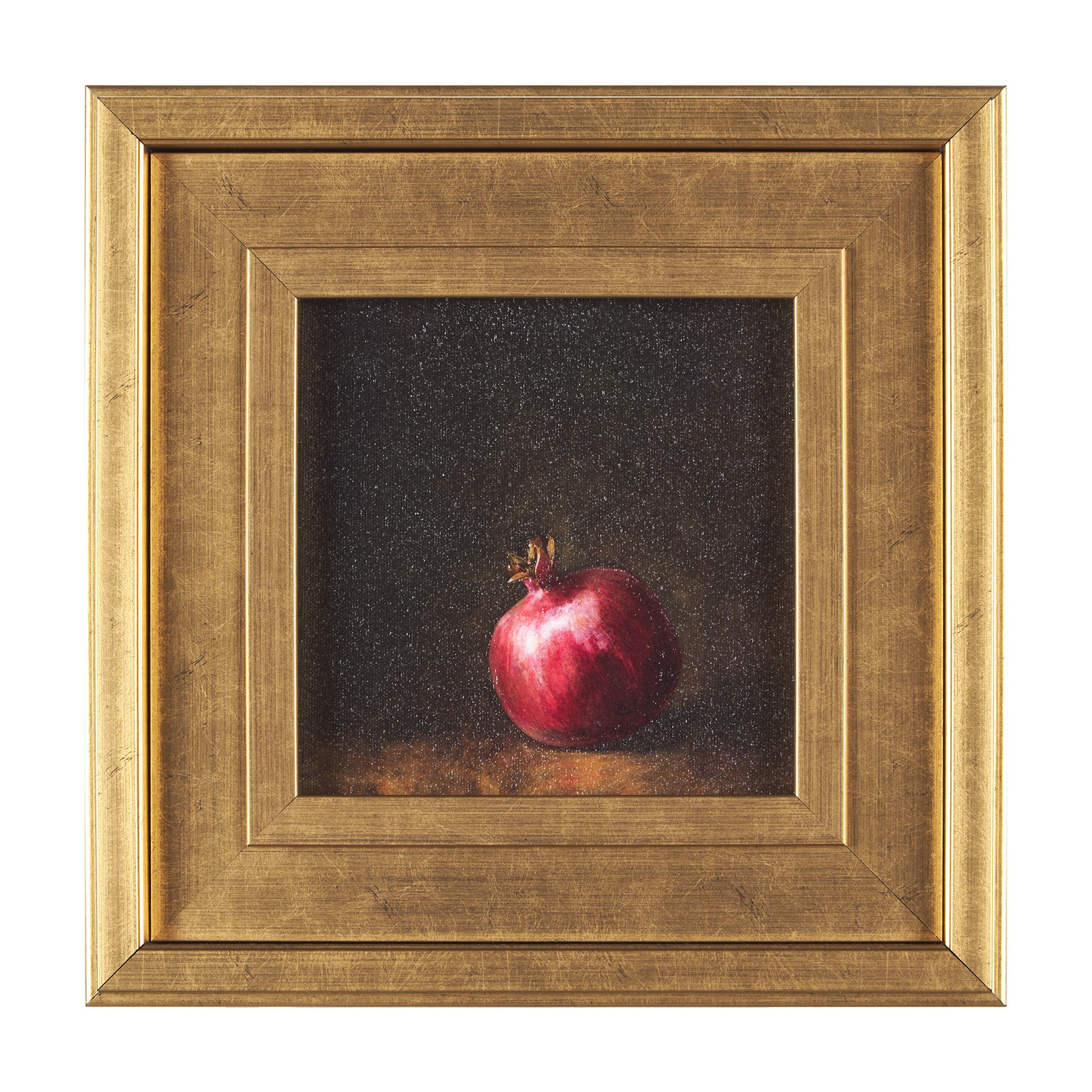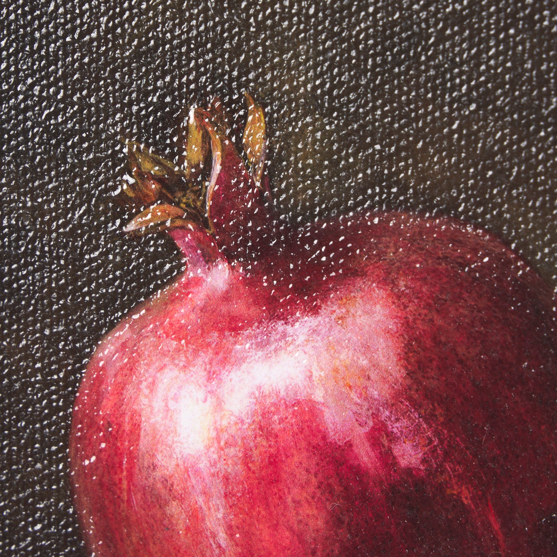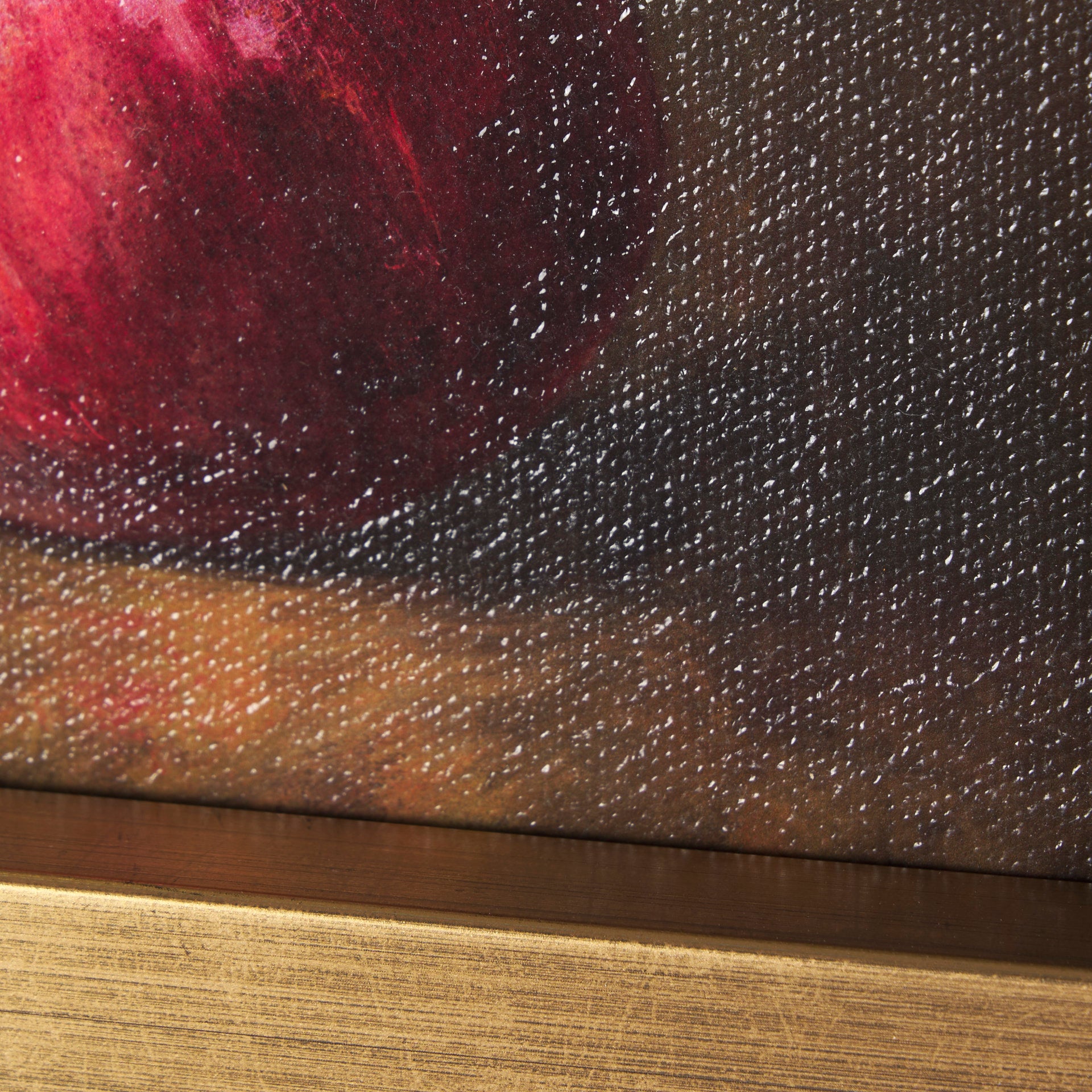 Lone Pomegranate is a hand-embellished acrylic art print on canvas that captures the quiet drama of a single pomegranate set against a rich, shadowed backdrop. The deep crimson fruit glows with hand-applied highlights and textured details, lending it depth and visual weight. Mounted with a backing and framed in an opulent gold-look frame, this piece brings timeless elegance — perfect for adding warmth and a refined, classical touch to kitchens, dining areas, or gallery-inspired spaces.